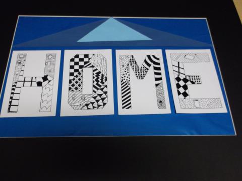 Zentangles "HOME"- Drawing: Students were given the task of showing their meaning of home in a Zentangle-like format. Questions and memories were generated to develop and organize ideas and graphics to depict their home/life. The final composition demonstrated adequate to extensive detailing, embellishments, and quality in each of the letters of the word "HOME."